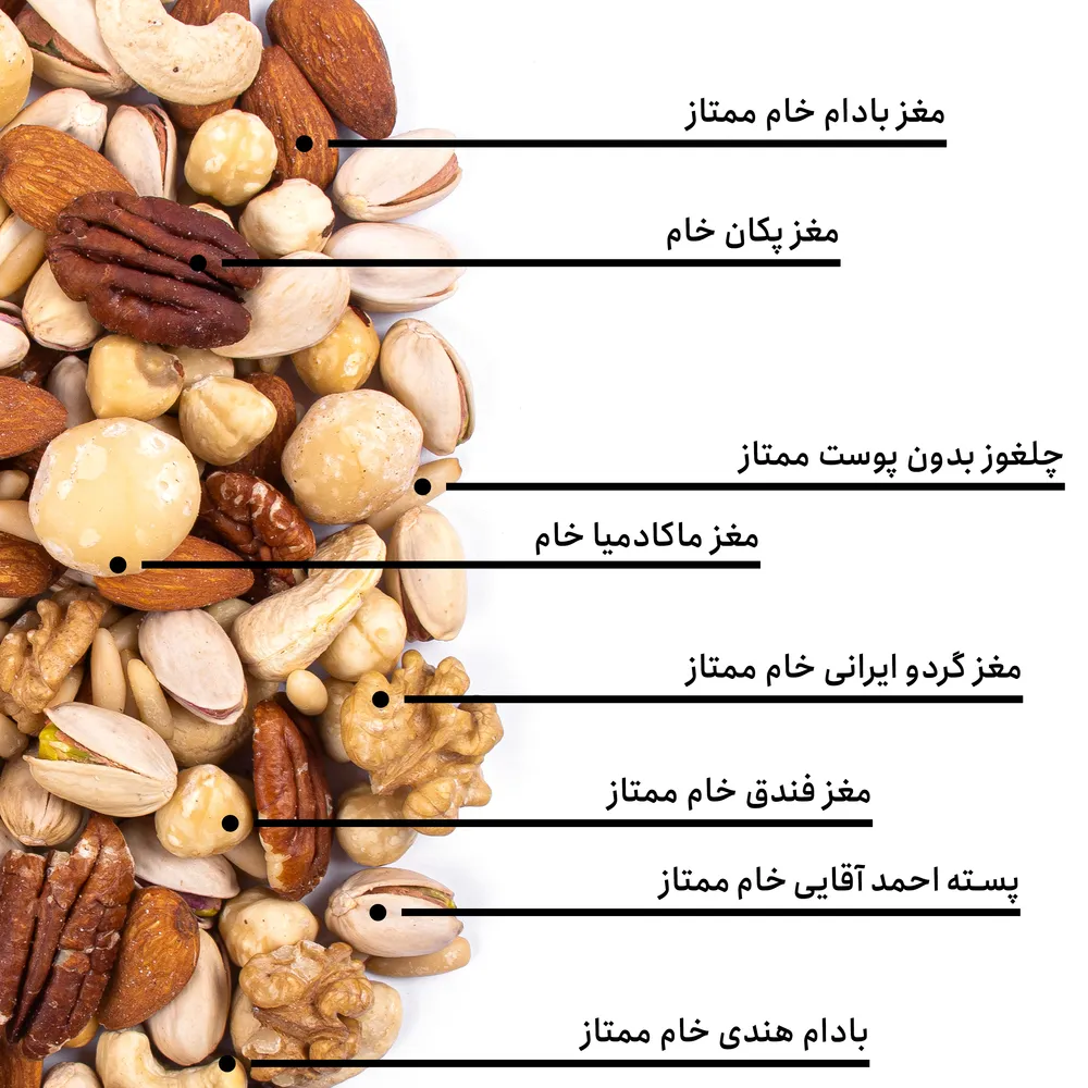 خیلی طول کشید تا محققان ثابت کنند که مصرف آجیل بسیار مفید است، اما بالاخره پس از مدتها ثابت شده که آجیل و مغزها حاوی پروتئین، چربیهای سالم و انواع ویتامین میباشد. بنابراین خوردن انواع مغزها به مقدار کافی و بعد از تمرین، بسیار موثر است! برای همین ما به شما مخلوط آجیل ورزشکان را توصیه میکنیم که شامل مغز بادام خام ممتاز، مغز فندق خام ممتاز، پسته احمدآقایی خام ممتاز، مغز گردو ایرانی خام ممتاز، مغز پکان خام، مغز ماکادمیا خام، چلغوز بدون پوست ممتاز، بادام هندی خام ممتاز است.