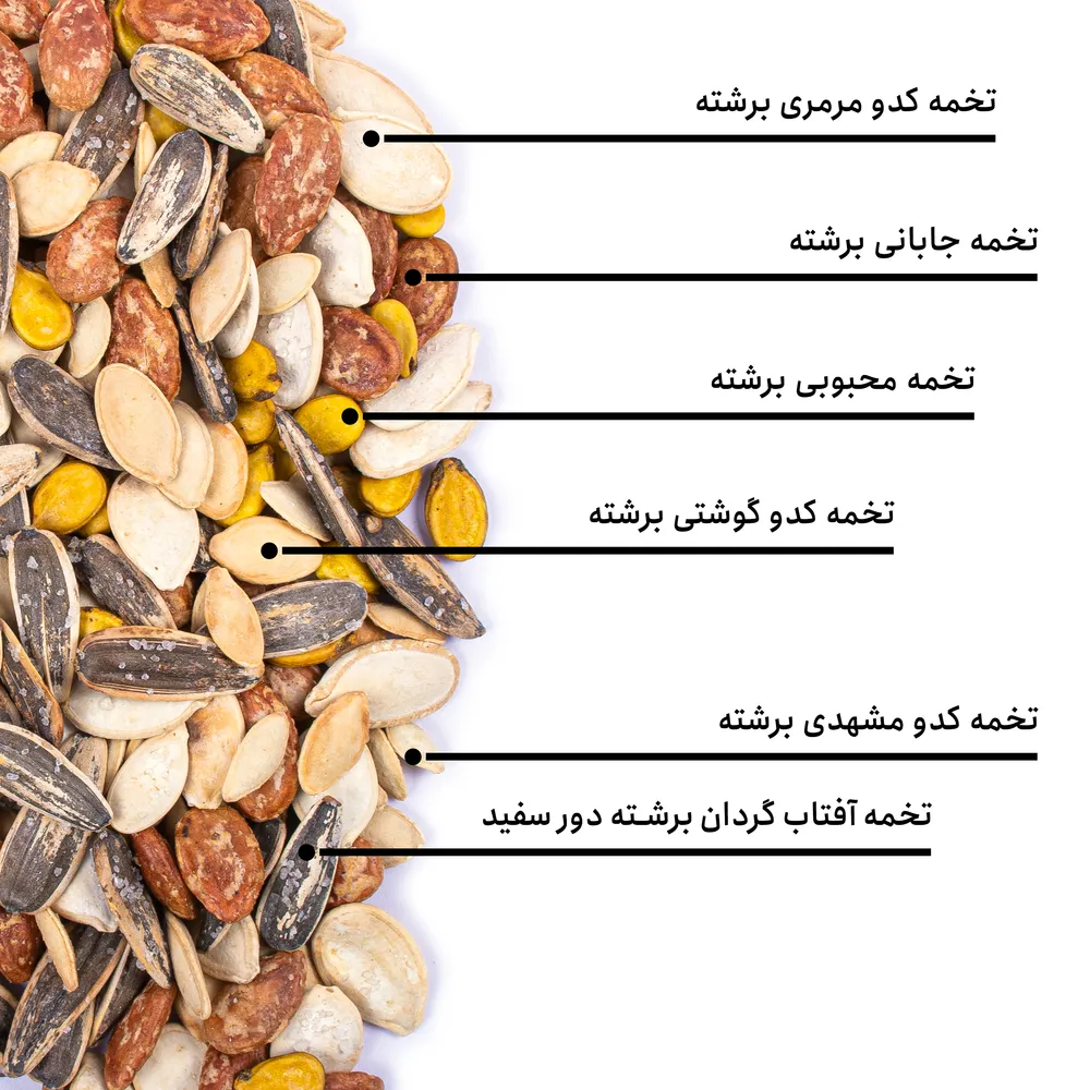 شما میتوانید با خرید مخلوط تخمه که شامل تخمه کدو مرمری برشته، تخمه آفتابگردان برشته دورسفید، تخمه جابانی برشته، تخمه محبوبی برشته، تخمه کدو گوشتی برشته، تخمه کدو مشهدی برشته است، این مشکل را حل کنید. ازطرفی، مهمانهای شما با هر سلیقهای از این انتخاب راضی هستند. درواقع با این خرید، نهتنها یک خوراکی برای پذیرایی از مهمان خودتان آماده کردهاید، بلکه شما گنجینهای از مواد مغذی را برای آنها فراهم کردید.