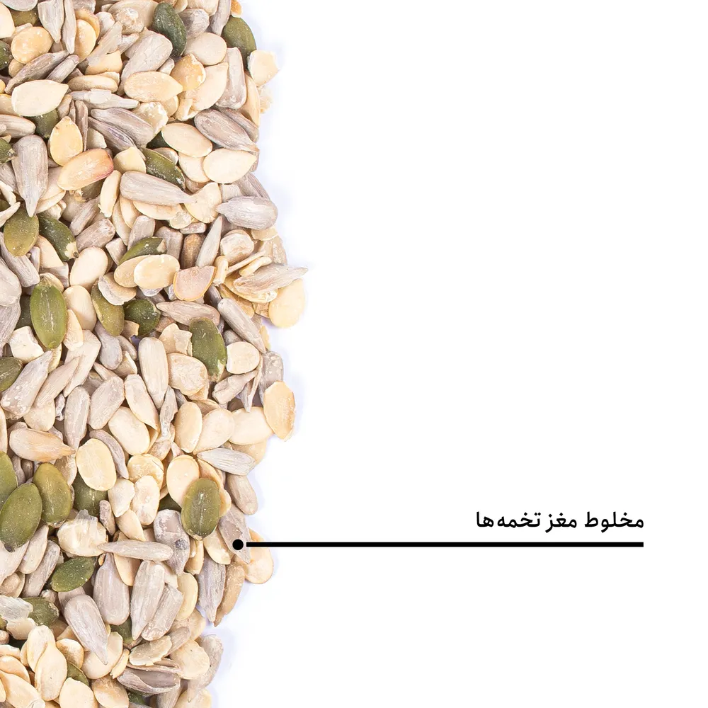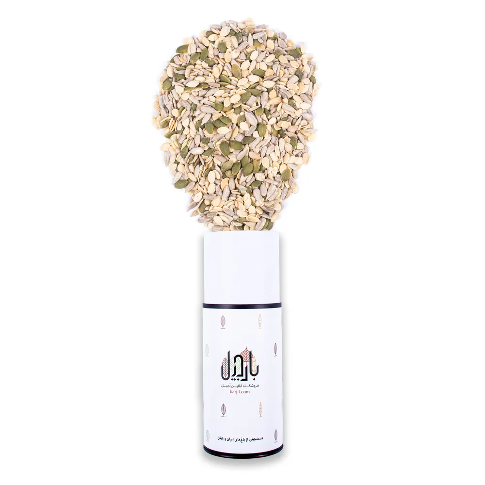انواع مختلف تخمه سرشار از چربیهای سالم، منیزیم، پتاسیم، منگنز، آهن و مواد معدنی هستند، این دانههای روغنی مفید برای سلامت قلب و عروق، تقویت استخوانها، پیشگیری از پوکی استخوان، سلامت پوست و مو ، بهبود سیستم ایمنی بدن میتواند بسیار موثر باشد. مخلوط مغز تخمه بارجیل حاوی مغز تخمه آفتابگردان خام، مغز تخمه کدو مرمری خام، مغز تخمه کدو گوشتی خام، مغز تخمه محبوبی خام است. خرید این نوع از آجیل مخلوط شما را از تهیه و خرید جداگانه هر کدام از این تخمهها بینیاز میکند. این محصول هم برای مصرف تنقلاتی و هم در تهیه انواع نان، شیرینی، کیک و ترکیب سالاد و دسرها کاربرد دارد. اکثر مغز تخمهها حاوی ویتامین E و دارای خواص آنتیاکسیدانی قوی هستند که برای کاهش و درمان التهابات، کاهش کسترول، سلامت قلب، کاهش فشارخون، تقویت عملکرد مجاری ادراری، تقویت استخوانها و آرامش و کاهش اضطراب بسیار موثر میباشند. به طور مثال وجود ویتامین A در مغز کدو به ترمیم و بازیابی سلولهای بدن کمک بسیاری میکند.